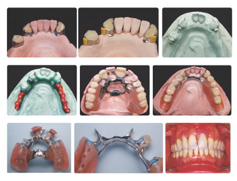 Mill-in Crowns denture 제작과정을 살펴보면 첫째, Primary part(도재관) 제작 후 DUR-friction-intra(황색)를 지대치관 높이에 맞게 절단 한 후 원심면에 부착한다. 둘째, 복제과정을 통해 내화성 모형을 제작한 다음 납형을 waxing-up하고 metal framework으로 주조한다. 셋째, 통법에 따라 덴쳐를 제작한 다음 metal framework 내면에 적정 유지력에 맞는 Arch-Friction-Soft(청색)를 선택하여 끼워 잘라내고 마무리한다(그림 2).
