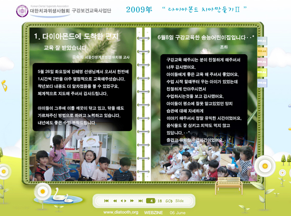 구강보건교육사업단에서 진행중인 '다이아몬드 치아만들기2'에서 매월 웹진을 발행, 다이아몬드 치아만들기 사업의 진행사황을 공개하고 있다. 웹진에는 사진 위주의 기사와 구강상식이 더불어 첨가돼 있다.