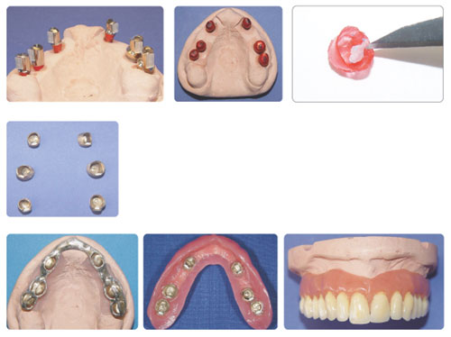 Arch-Friction-Soft System을 이용한 Implant Telescopic Overdenture 제작과정을 살펴보면 첫째, 내관부 메탈 밀링 후 DUP-Friction.2(intra)를 절단하여 한 방향으로 friction이 발생되도록 부착한다. 둘째, 패턴레진으로 코핑을 제작하여 경화시킨 다음 내면에 위치된 DUP-Friction.2(intra)를 조심스럽게 빼낸다. 셋째, DUP-Friction.2(intra)가 제거된 패턴 레진을 주조한 다음 유지력에 맞는 arch-friction-soft를 선택(흰색이나 청색)하여 끼워준다. 넷째, Metal framework을 제작한 다음 통법에 의해 덴쳐를 완성한다. 다섯째, 유지력 정도에 따라서 arch-friction-soft(6개) 중에서 선택하여 교체한다(그림 2).