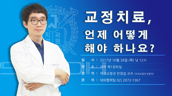 서울치대병원(병원장 허성주)이 오는 26일 치과병원 지하 1강의실서 ‘교정치료, 언제 어떻게 해야 하나요’ 주제로 일반인 대상 무료공개강좌를 개최한다.