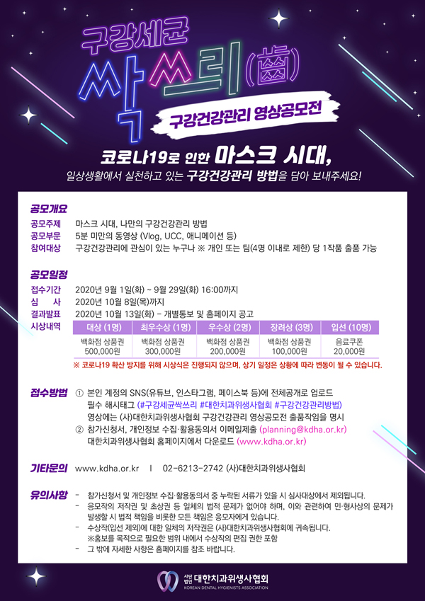 ‘구강세균 싹쓰리(齒)-구강건강관리 영상공모전’ 이름으로 열리는 이번 공모전은 ‘마스크 시대, 나만의 구강건강관리 방법’ 주제로 펼쳐진다. 블로그나 UCC, 애니메이션 등 형식 제한 없이 5분 미만의 영상을 제작해 출품하면 된다.