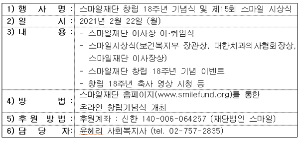 다음은 2월 22일 온라인으로 개최되는 스마일재단 기념식과 스마일시상식 주요 일정이다.