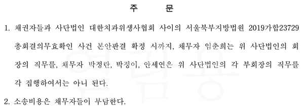 대한치과위생사협회 임춘희 회장 등 선출직 부회장에 대한 직무정지 결정이 내려졌다. 서울북부법원은 4월 27일 치위협 선출직 회장단에 대한 직무집행정지 가처분 소송서 ‘인용’ 결정을 내렸다.