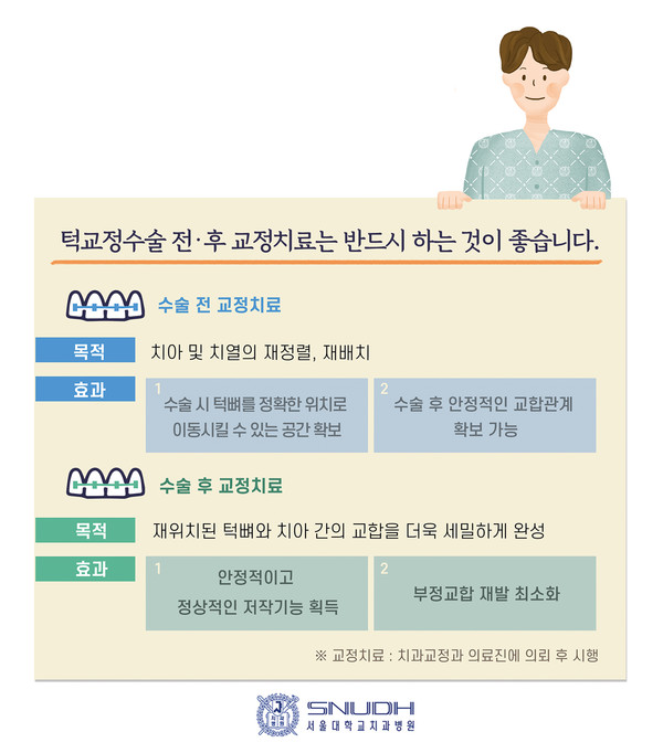 수술 후 치아교정 치료는 보통 수술 시행 후 약 2개월 이내에 시작한다. 수술 전 교정치료, 턱교정수술, 수술 후 교정치료의 과정은 서로 독립된 치료가 아니라 서로 연결된 하나의 치료과정이다.