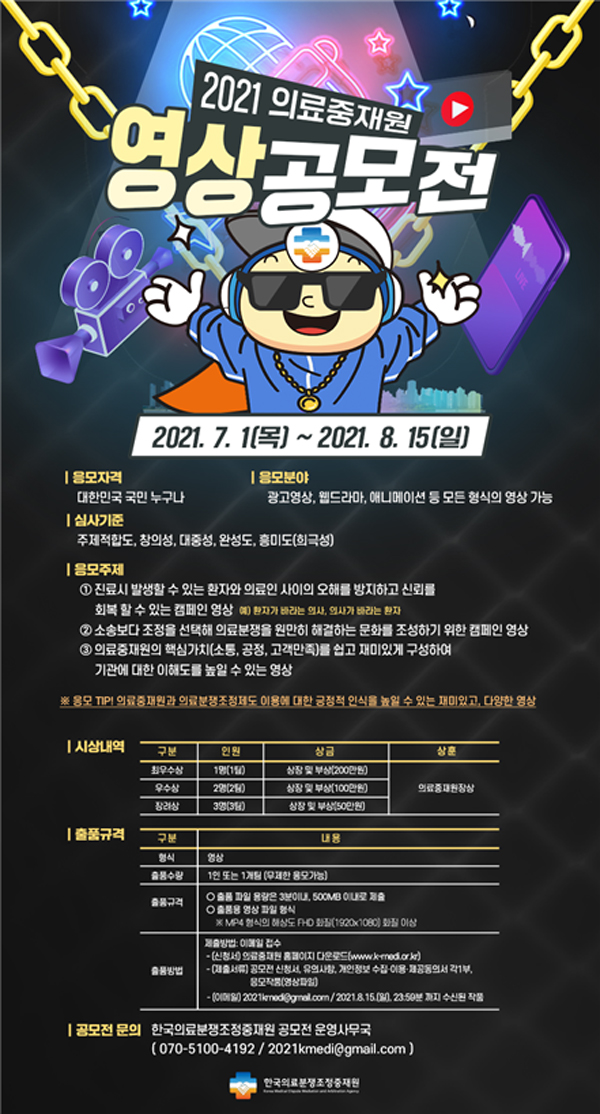 이번 공모전은 의료중재원에 대한 이해도를 높이고, 의료분쟁 발생시 도움을 받을 수 있는 조정중재제도를 알리기 위해 기획되었다.