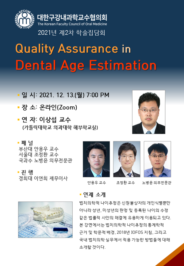 이번 학술집담회 주제는 ‘Quality Assurance in Dental Age Estimation’으로 잡아, 법치의학적 나이추정의 실정과 가치를 다룰 예정이다.