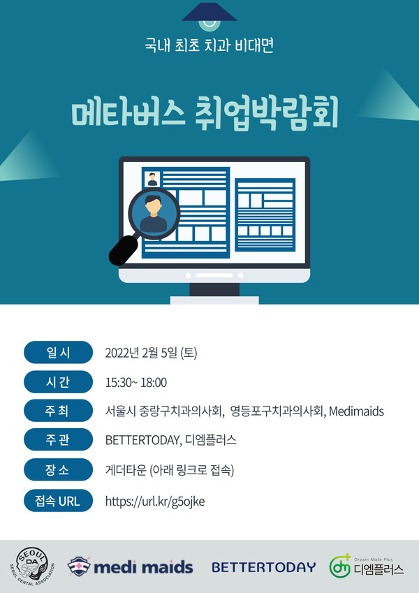 이번 취업박람회서는 서울 중랑구와 영등포구 소재 12개 치과가 소개된다. 대상은 올해 치위생과 졸업생을 대상으로 구직희망자 사전신청을 받아, 치과와 구직희망자가 비대면으로 개별면접을 진행하게 된다.