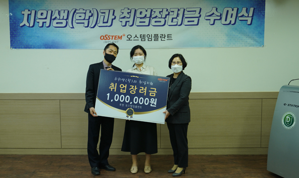 이번 취업장려금 첫 수여자는 동남보건대 치위생과 3학년 조수현 학생이 선정됐다. 조수현 학생에겐 오스템임플란트가 후원하는 취업장려금 100만원이 수여됐다.