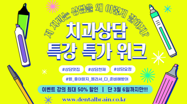 한편 이번 상담 기획전은 덴탈브레인 연간 유료회원 가입 시 최대 50% 할인 혜택이 주어진다. 덴탈브레인 연간 가입비는 9만9천원이며, 가입 시 1년 동안 다양한 강의를 무료 또는 할인 혜택을 받으며 이용할 수 있다.