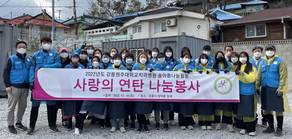 강릉원주대치과병원(병원장 박찬진) 임직원 30여명은 지난 19일 강릉시 성덕동 일대서 어려운 이웃을 위한 ‘사랑의 연탄나누기’ 봉사를 실시하였다.