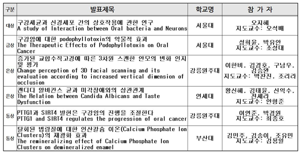 이번 학술대회에는 강릉원주대치과대학 이연준-박경원 학생(지도교수 최종호)의 ‘PTTG1과 SIRT4 발현은 구강암의 진행을 조절한다’ 연구 포함, 전국 11개 대학서 18개 학생팀이 참가하여 연구결과물을 영어로 발표했다.