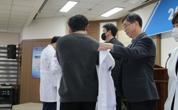 다음으로 white coat ceremony가 펼쳐졌다. 이 행사는 치과대학 교수 상조회서 지급한 white coat를 직접 지도교수가 개별적으로 착복시켜 준다.