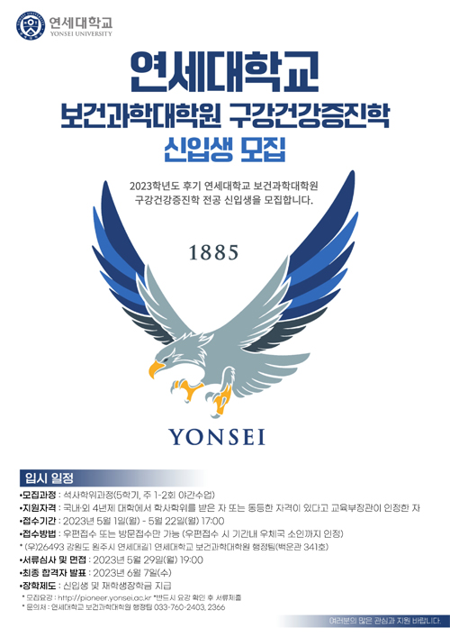 연세대가 치과위생사를 위한 구강건강증진학 전공 석사과정 2023년 후기 신입생을 모집한다.