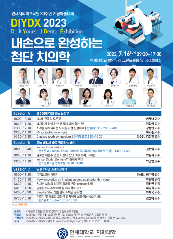 학술프로그램에는 △근관치료 △디지털 덴티스트리 △보툴리눔톡신 주사법 등 3개의 핸즈온 강연이 준비되어 있다. 핸즈온 프로그램은 학술대회 등록 시 별도의 신청이 필요하고, 수강생에게는 연세대 치의학교육원 수료증이 발급된다.