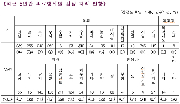 또한 최근 5년간 의료사고 감정 처리된 7,541건을 사고내용별로 분류하면 증상악화 2,483건(32.9%), 진단지연 622건(8.2%), 장기손상 539건 (7.1%), 신경손상 526건(7.0%) 등의 순으로 나타났다.