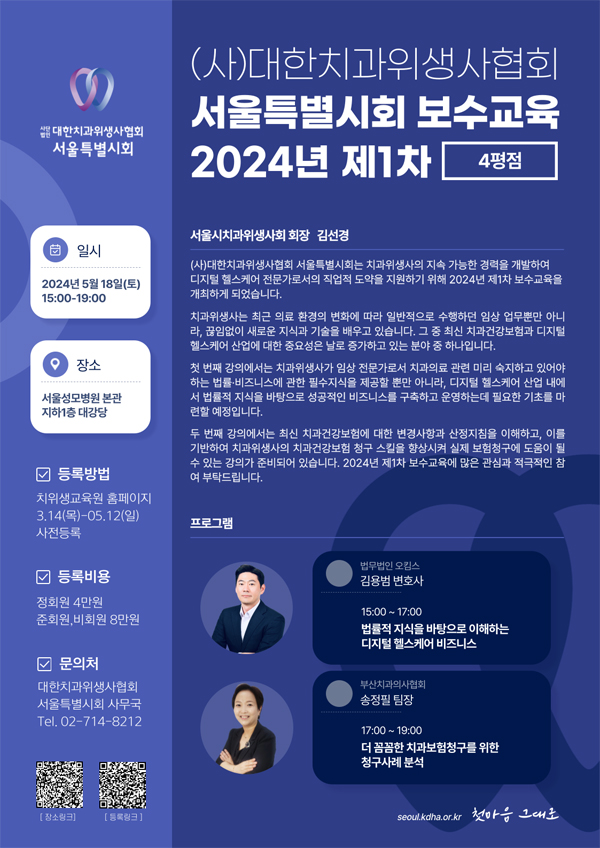 치위협 서울회(회장 김선경)가 오는 5월 18일 서울성모병원 지하1층 대강당서 ‘2024년 제1차 보수교육’을 개최한다. 이번 보수교육 참가자에게는 보수교육 점수 4점이 인정된다.