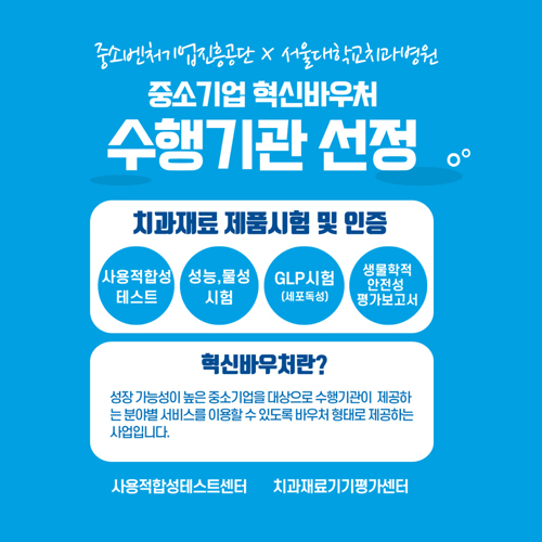 서울대치과병원(병원장 이용무)이 지난 3일 '중소기업 혁신바우처 사업‘ 수행기관으로 선정됐다.