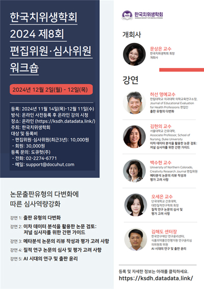 한국치위생학회(회장 문상은)가 지난 2일~12일 기간 동안 ‘제8회 편집위원·심사위원 워크숍’을 성공적으로 마무리했다.