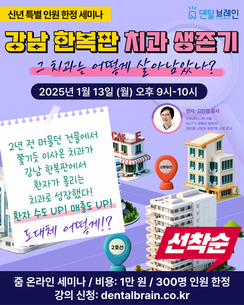 치과 온오프라인 교육 플랫폼 덴탈브레인(www.dentalbrain.co.kr)이 오는 13일 오후 9시 ‘강남 한복판 치과생존기: 그 치과는 어떻게 살아남았나?’ 주제로 새해 첫 세미나를 개최한다.