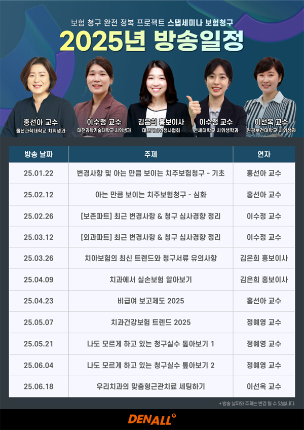 세부적으로는 치주보험, 보존·외과 파트, 비급여 보고제도, 청구실수 분석 등 실무 중심의 교육을 제공할 예정이다. 평소 실무자들이 놓치기 쉬운 청구실수와 최신 트렌드를 공략하는 강의로 시청자들의 관심을 불러 일으킬 것으로 기대된다.