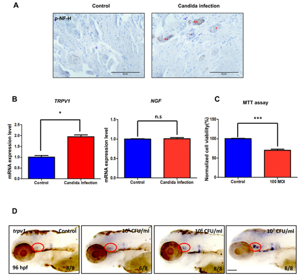 연구팀은 임상 환자 데이터, 마우스 모델, 제브라피쉬 모델을 이용하여 Candida albicans 감염과 TRPV1의 상관관계를 분석했다. 연구결과 감염 환자들은 TRPV1 발현 증가로 인해 신경 염증과 통증이 심화되었고, 항진균제(나이스타틴) 치료 후 증상이 개선됐다.