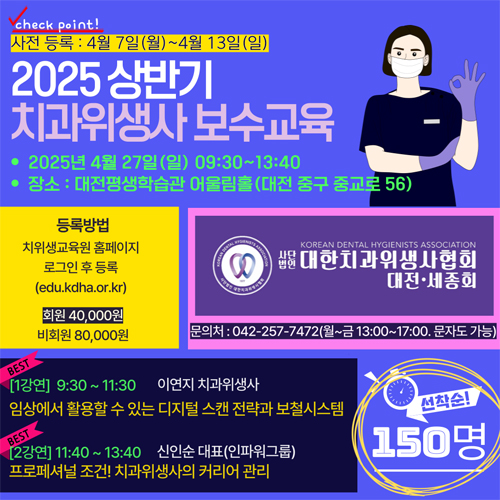 한편 대전세종회 보수교육 사전등록은 4월 7일~4월 13일까지다. 등록은 치위협 치위생교육원 홈페이지서 가능하고, 등록방법과 자세한 내용은 대전세종회 홈페이지 또는 전화(042-257-7472)로 문의하면 된다.