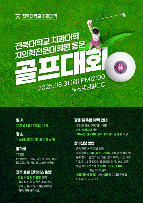 전북치대 동문골프대회가 오는 8월 31일 12시 경기도 이천 소재 뉴스프링빌 CC서 개최된다.