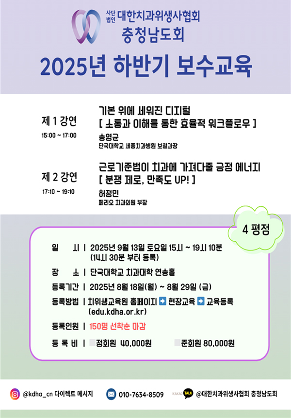 치위협 충남회(회장 유명숙) 하반기 보수교육이 오는 9월 13일 천안 단국대치과대학 연송홀서 개최된다.