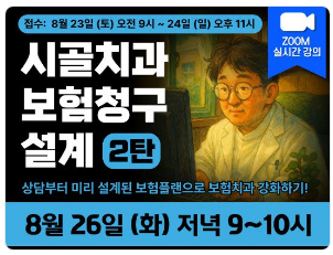 치과 온·오프라인 교육 플랫폼 덴탈브레인이 8월 26일 화요일 저녁 9시부터 1시간 동안 개원의 대상으로 ‘시골치과 보험청구 설계 2탄-진단과 진료 흐름까지 연결된 보험 설계로 치과를 체계화하기’ 온라인 세미나를 개최한다.