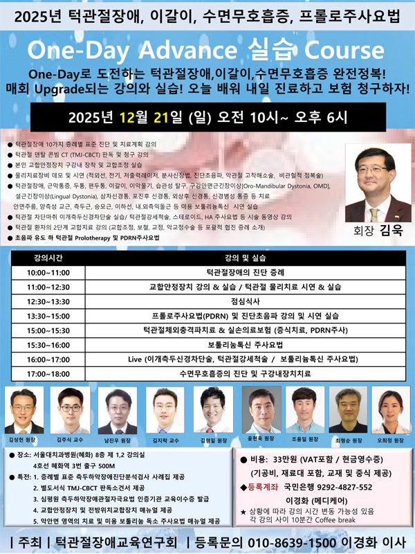 이와 함께 이번 심화과정에선 턱관절장애 뿐 아니라 근막통증, 두통, 편두통, 습관성 탈구, 구강안면근긴장이상(Oro-Mandibular Dystonia), 설근긴장이상, 신경병성 통증 등 다양한 질환의 치료접근법도 함께 다룬다.