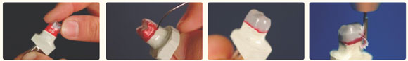 이용시 고려사항을 차례로 살펴보면 첫째, Adapta carrier foil 0.6mm(white)와 Adapta spacer 0.1mm(redt)인 스페이서를 홀더 내에 위치시키고 둘째, 두 장의 플라스틱 호일을 홀더 중앙에 위치되도록 하고 천천히 버너 위(알코올 램프 등)에서 가열하여 호일이 투명해지도록 한 다음 미리 가열된 호일을 즉시 modeling 중앙에 홀더로 올려주고 셋째, 플라스틱 호일을 stump 내의 modeling 재료 중심 쪽에 냉각되지 않도록 즉시 넣어 호일이 불투명해질 때까지 누르고 있어야 하며(약 10초 정도) 넷째, 가위를 이용해 호일을 3-4회 잘라 크라운 stump를 제거하고 호일의 넓은 아웃라인 내에서 가위로 플라스틱 캡을 잘라주며 다섯째, White plastic cap에서 red plastic cap인 스페이서를 핀셋으로 조심스럽게 빼내 분리시킨 다음 white plastic cap의 가장자리보다 약 1/3 정도 짧게 잘라내고 치형상에 시적하며 여섯째, White plastic cap의 가장자리를 마진부에서 1∼2mm 정도 떨어지도록 잘라낸 다음 스페이서가 시적된 치형상에 위치시키고 일곱째, 치경부 왁스로 접촉되는 부분이 없는 crown margin부에 왁스 업을 하고 잉여 왁스를 제거한 다음 전용 밀링 왁스를 이용하여 해부학적인 형태보다 약간 크게 치형상에 납형을 완성한다(그림 2, 3).