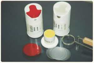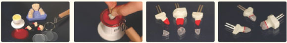 코너스크로네 내관 제작시에 이용되는 재료는 왁스 디핑법이나 패턴 레진에 의한 축성법 그리고는 Adapta Deep drawing system 등을 이용하는 데 이중에서 술자의 기호대로 선택적으로 이용하고 있다. 이중에서 Adapta Deep drawing system을 이용하면 내관의 임의적인 두께 선택, 왁스 밀링시 파절 등을 막아 쉽고 정교하게 내관을 제작할 수 있어 임상에 널리 이용되고 있는 시스템이다(그림 1). Adapta deep drawing system은 삭제된 치아의 정밀한 크라운 캡(crown cap)과 임시 크라운(temporary crown)을 신속하고 정밀하게 제작하기 위해 고안된 것으로써 소환과정에서 완전하게 연소되는 아크릴릭 재료로 제작되어 있어 konuskronen 내관 제작 시 일정한 두께로 적합도 높게 제작할 수 있는 시스템이다.